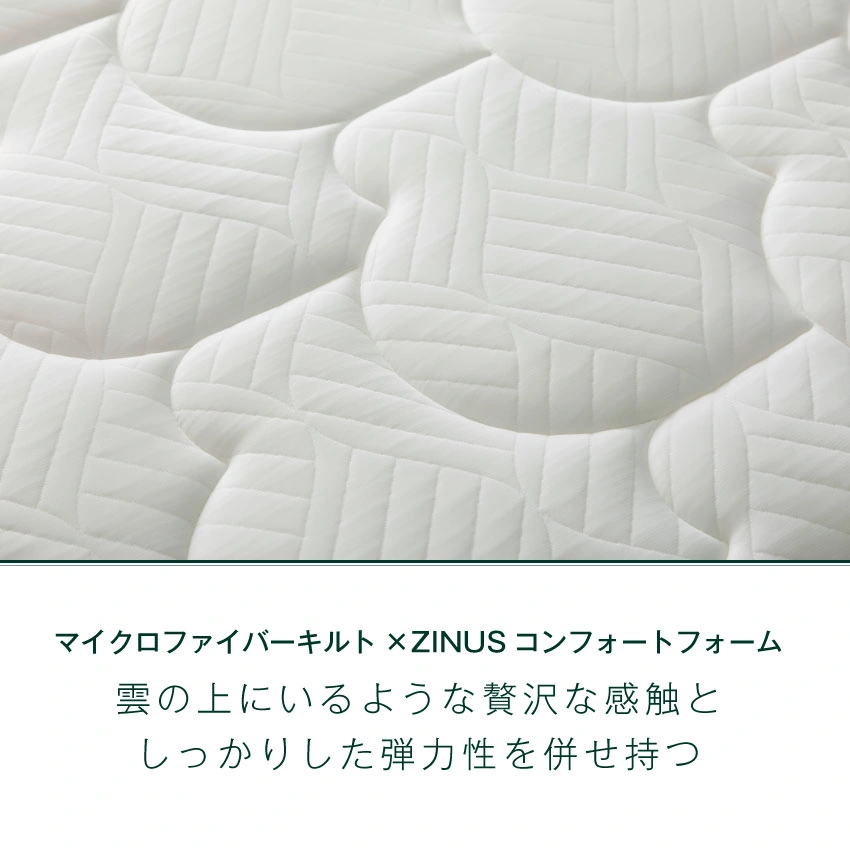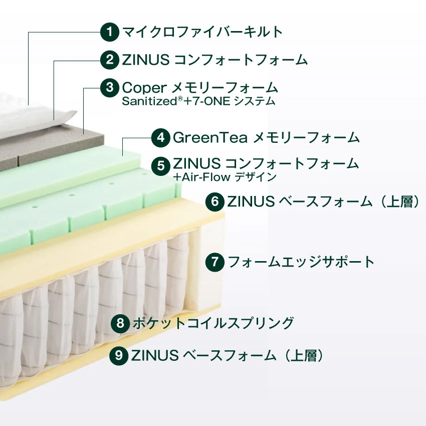 ZINUSの代名詞であるGreenTeaメモリーフォームは、天然の緑茶成分と活性炭素成分が配合されたメモリーフォームで、清潔な睡眠環境を維持します。体圧分散に優れたフォームが快適な寝心地をサポートします。
