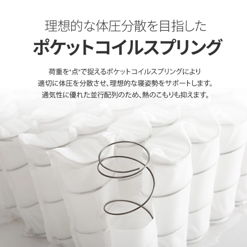 やや硬めの寝心地で、体をしっかりと支えながらも優しく包み込む絶妙なバランスを実現。 独立したポケットコイルが体の凹凸にフィットし、沈み込みすぎず安定した姿勢を保ちます。