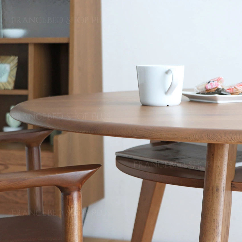 オーク無垢材をふんだんに使った、高級感ある円形のダイニングテーブル。程よい木の質感と綺麗な木目が印象的で、丸みのある上品な雰囲気です。
