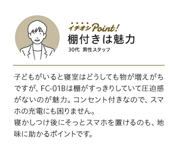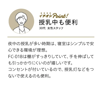 LED照明・スイッチ・1口コンセント付きで、夜間の授乳やスマホ充電にも便利。小物収納にも最適です。