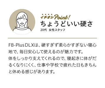 2層合わせてお使いいただくことをベストに考えて作られているFB-Plus。ベースマットレスでは、スプリングでしっかりと身体を支え、こだわりの詰物を使用したトッパーでふんわりと優しく包み込みます。